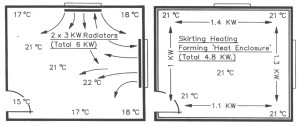 From laboratory and practical test experience, if either the Elpan (electric) or Wanpan (hydronic) skirting board radiant heating systems are installed in the way indicated above required energy consumption may be reduced by a factor of 0.8 against that considered necessary for local heat appliances (radiators etc).