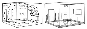 Conventional radiators produce a high temperature immediately above the radiator and a warm layer under the ceiling. The lowest temperature is at the floor height and this causes discomfort from draughts. High energy consumption due air convection.